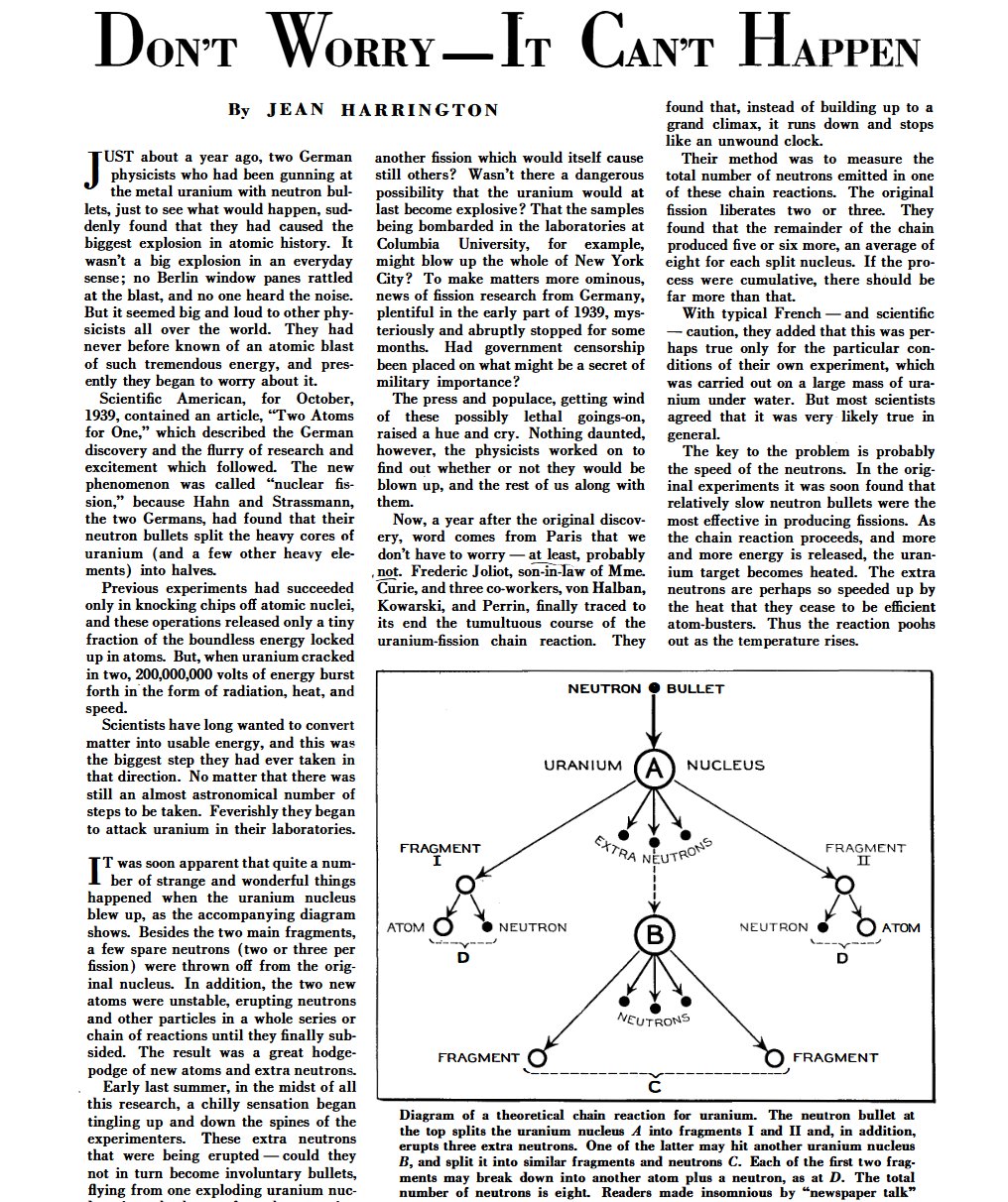When @fermatslibrary brought up this 1940 paper about why we have nothing to worry about from nuclear chain reactions, I first checked that it was real and not a modern forgery. Because it seems almost too good to be true in the light of current AI safety talk.