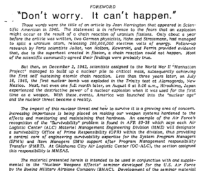 atmospheric ignition by fusion discussed later in the Manhattan project and dealt with in the famous (in existential risk circles) report E. J. Konopinski, C. Marvin, and E. Teller, “Ignition of the Atmosphere with Nuclear Bombs,” Los Alamos National Laboratory,